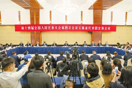 3月7日,出席十四届全国人大四次会议的云南省代表团举行集中审议,会议向境内外媒体开放。 本报记者 陈飞 胡妤雅 摄