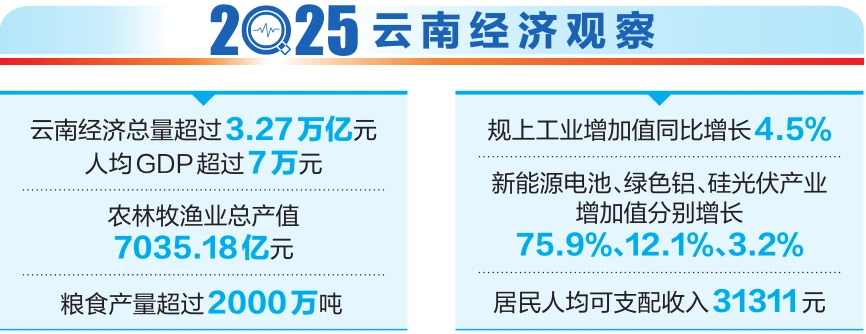 以数观形,以数察势。透视2025年云南经济成绩单,高质量发展的足迹愈发清晰:这一年,云南顶压前行、向新向优发展,交出了一份来之不易的成绩单,展现了行稳致远的韧性和活力,更彰显了破浪前行的决心和底气。