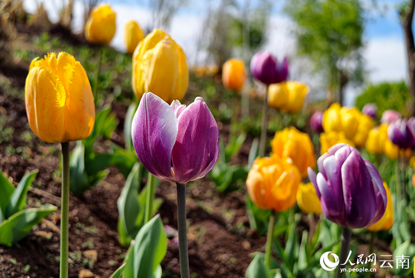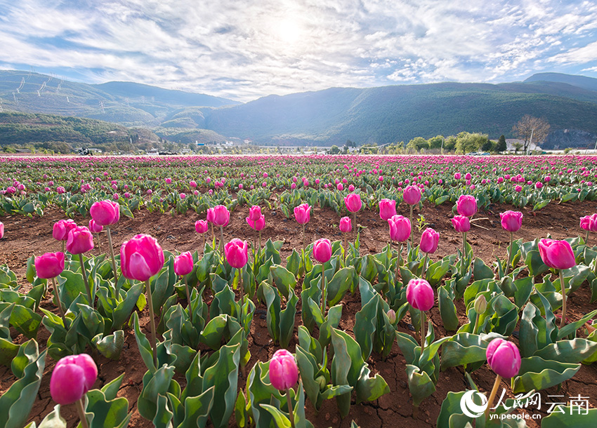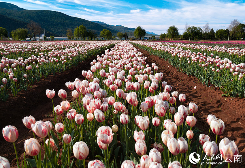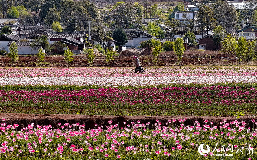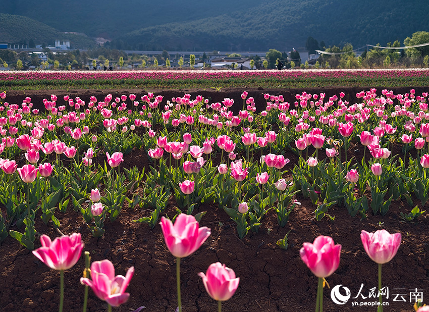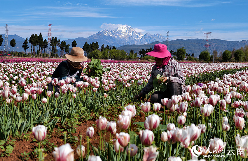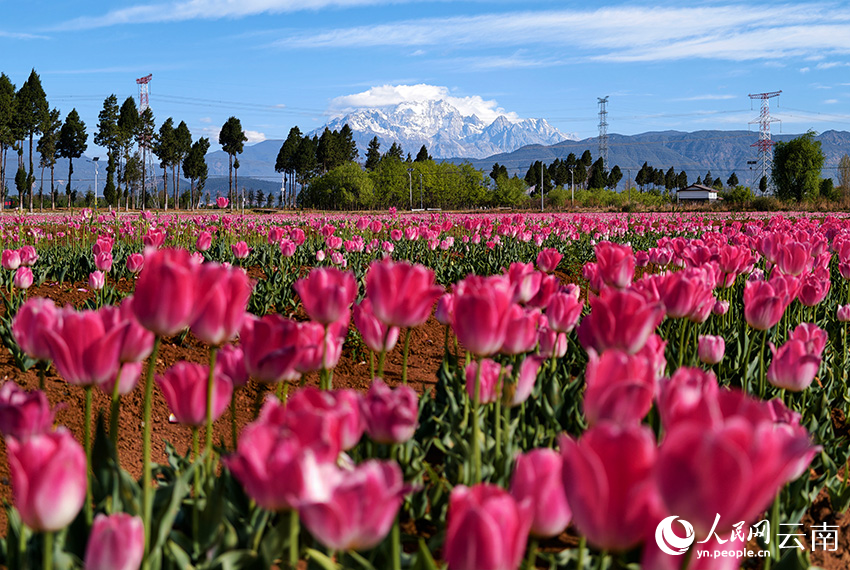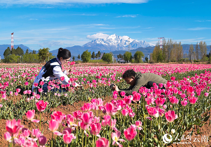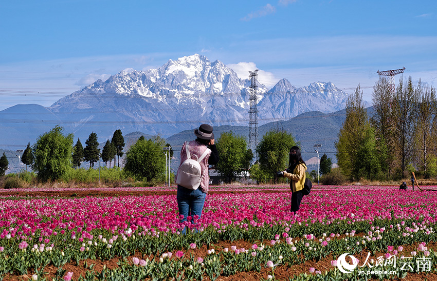 人民网丽江4月14日电 仲春时节,在云南省丽江市古城区丽江现代花卉产业园区内的四季花开景区内,200多亩、超1600万株郁金香迎来盛花期。红、粉、白、紫交织铺展,宛如彩色地毯向远方绵延,与远处巍峨的玉龙雪山相映成景,勾勒出一幅绝美的高原春日画卷。