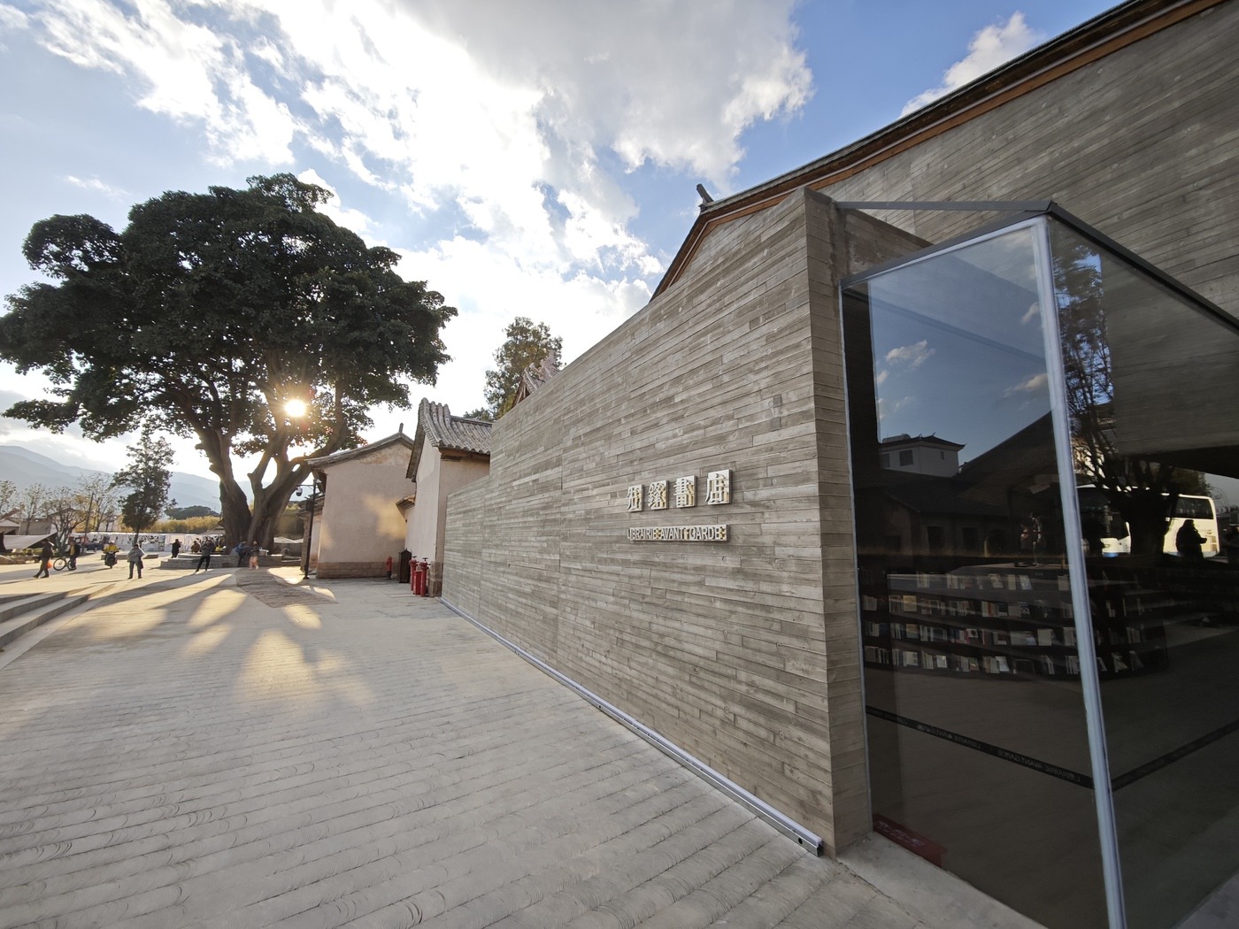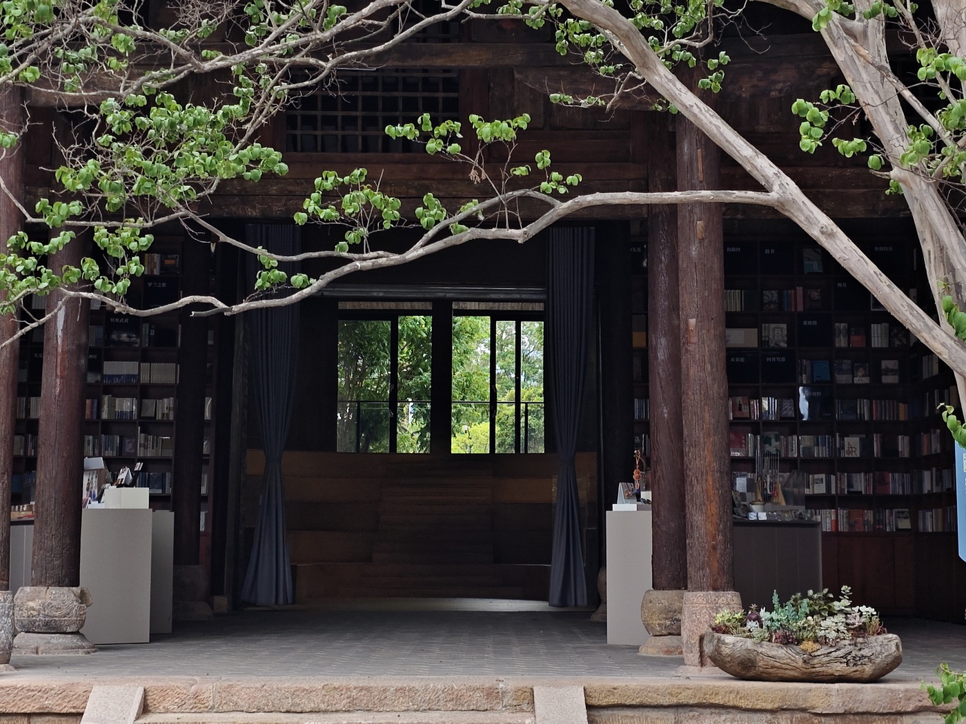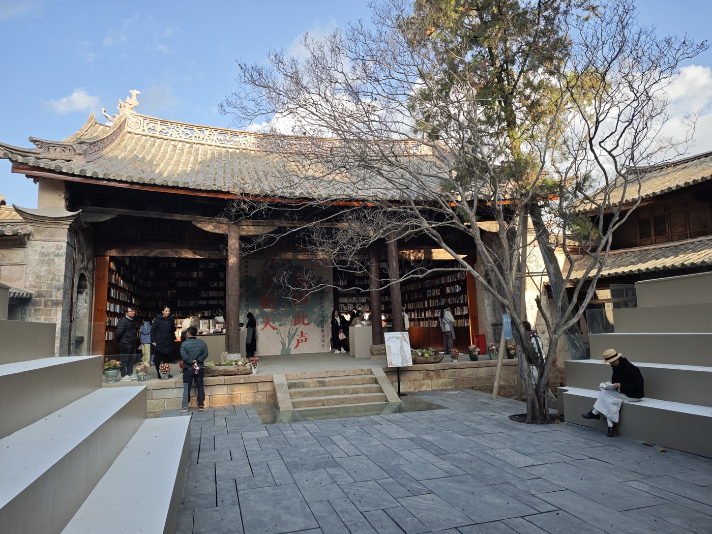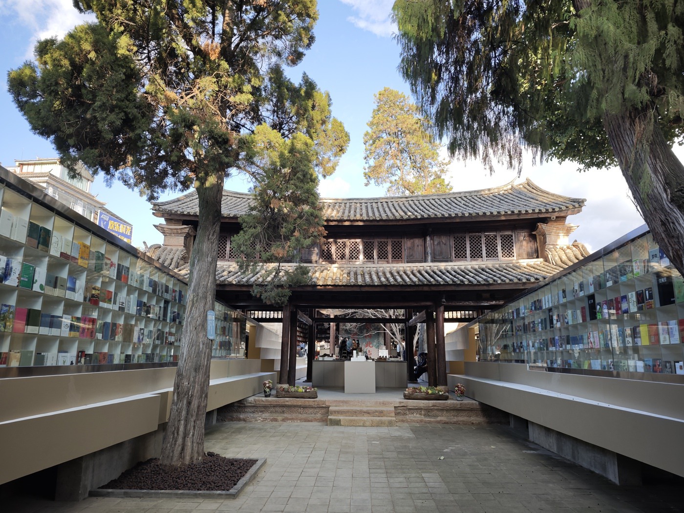 2021年,巍山县政府与南京先锋书店达成合作,既严守 “修旧如旧” 原则,完整保留古建筑肌理,又以现代设计注入新活力——庭院中架起钢结构书廊,连接分散院落;下沉式阶梯阅读区、临街玻璃幕墙、白色阶梯等现代空间,与斑驳朱红圆柱、剥漆木梁、精美砖雕木雕相映成趣,实现新旧元素的温柔对话。2023年12月23日,书院正式开放,成为集书店、展览、小剧场、咖啡、文创于一体的综合性文化空间。
